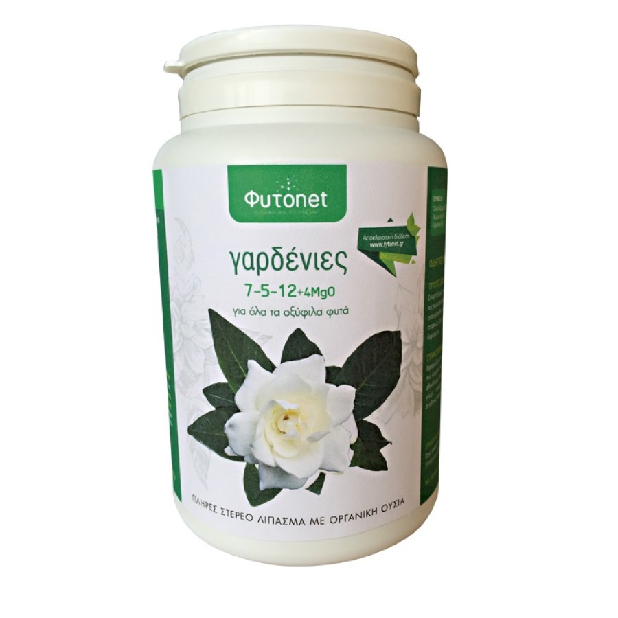 Το λίπασμα ‘’Φυτοnet Γαρδένιες’’ είναι ένα ειδικό πλήρες λίπασμα ιδανικό για οξύφιλα φυτά όπως οι Γαρδένιες , οι Καμέλιες , οι Ορτανσίες , τα Ροδόδεντρα , οι Αζαλέες κ.α. , σε στερεή μορφή μικροκόκκων υψηλής διαλυτότητας.